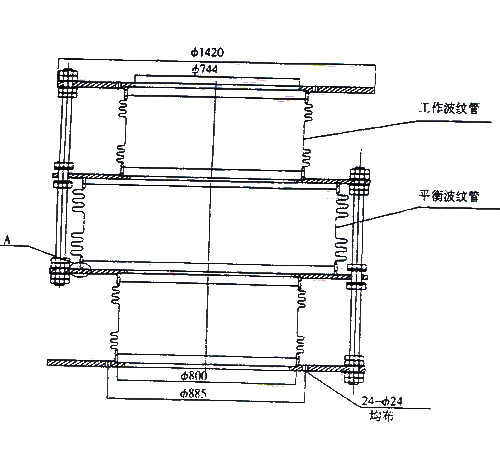 (4)將力平衡波紋管補(bǔ)償器已完成焊接的上部分穿過中間組件4放置在力平衡波紋管補(bǔ)償器的下部分的中間法蘭上,并利用力平衡波紋管補(bǔ)償器拉桿進(jìn)行初步調(diào)整,是法蘭間距相等。