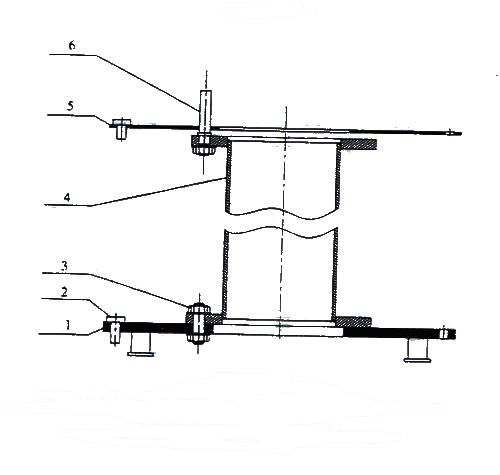 (3)將力平衡波紋管補(bǔ)償器已完成焊接的下部分穿過中間4放置于帶底座的下法蘭1上,并用定位銷2與工作下法蘭定位固定。