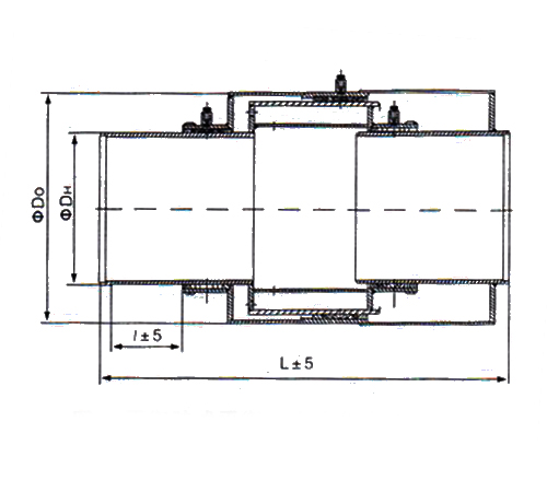 結(jié)構(gòu)特點是:采用三個填料密封箱;準(zhǔn)確的設(shè)計一個封閉流體環(huán)腔,利用流體靜壓力產(chǎn)生對兩側(cè)管道的拉緊力,抵消管道拐彎或盲端處固定支架上作用的流體推力。這種結(jié)構(gòu),由于流體直通式流懂,所以流體阻力損失很小,安裝長度短。