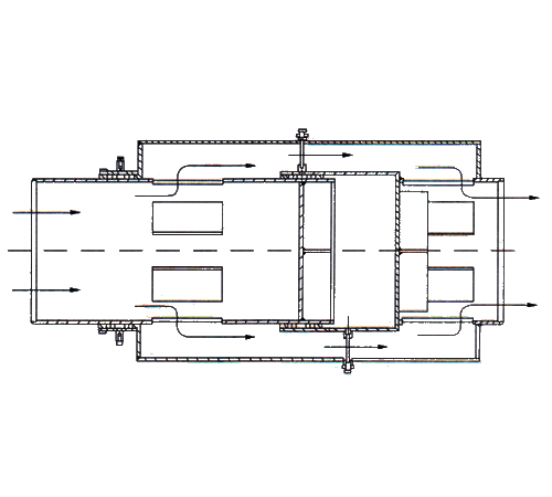 結(jié)構(gòu)特點是:外套管串聯(lián)兩個填料密封箱,內(nèi)套管后端加擋板,流體經(jīng)內(nèi)套管的孔道引到兩密封箱間隔腔,再經(jīng)外套管間隔腔處孔道,引回到后部加擋板的主管道。這種補償器比平衡腔式補償器減少一個密封箱,結(jié)構(gòu)簡單,但比平衡腔型補償器重量大,安裝尺寸長。