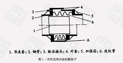 一次性直埋膨脹節(jié)結(jié)構(gòu)型式見(圖1)其工作原理是將該種產(chǎn)品裝在管道上后,給管道加熱到要求的溫度,管道熱伸長,波紋膨脹節(jié)被相應(yīng)壓縮,在此狀態(tài)下將外套4在A環(huán)縫處密封焊接,補(bǔ)償后的膨脹節(jié)為剛性整體,用一次性直埋式波紋補(bǔ)償器、膨脹節(jié)補(bǔ)償了該段管路在設(shè)計(jì)溫差下產(chǎn)生變形,它的作用使管路工作中拉伸或壓縮的平衡點(diǎn)處在設(shè)計(jì)溫差下變形總量的中點(diǎn)。使拉伸、壓縮應(yīng)力基本相等,起到降低管路拉伸或壓縮變形應(yīng)力的作用。